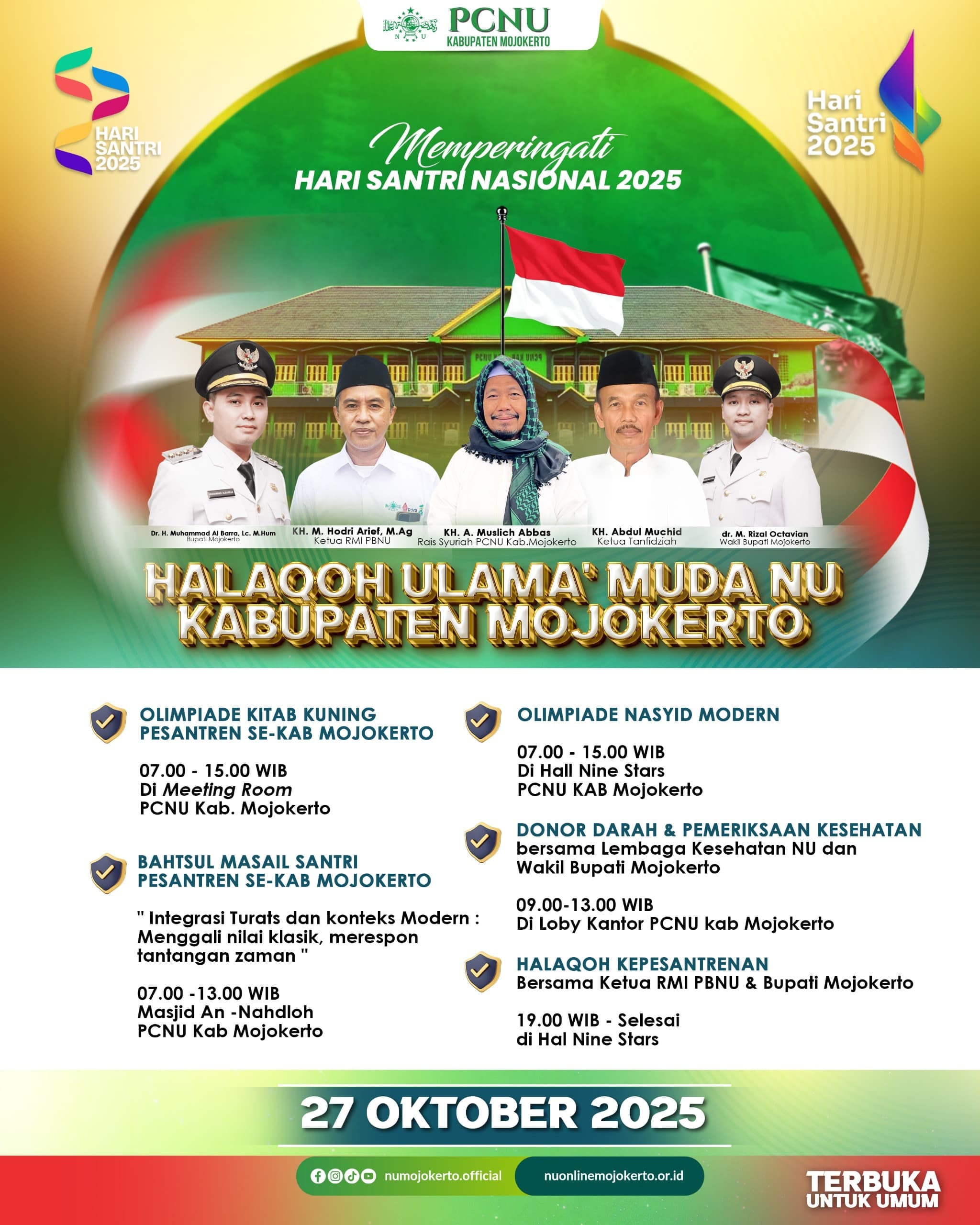 Mojokerto – Pengurus Cabang Nahdlatul Ulama (PCNU) Kabupaten Mojokerto akan menggelar serangkaian acara untuk memperingati Hari Santri Nasional 2025 pada tanggal 27 Oktober 2025. Rangkaian acara ini meliputi berbagai kegiatan yang melibatkan santri, ulama, dan masyarakat umum.